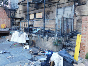 The fire mostly caused superficial damage however a tent belonging to a member of the homeless community also caught fire. Nobody was injured as a result of the fire.