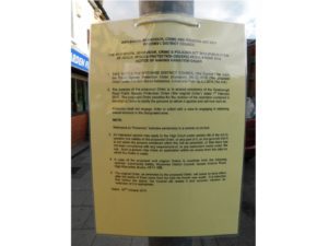 A series of yellow notices, dated 22nd October 2018, have recently been displayed on lamp posts in Desborough Road making the public aware that Wycombe District Council has made the Public Spaces Protection Order (Variation) (No. 2) 2018 under the Anti-Social Behaviour, Crime and Policing Act 2014.